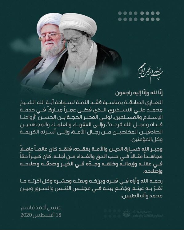 بسم الله الرحمن الرحيم إنّا لله وإنّا إليه راجعون التعازي الصادقة بمناسبة فَقْد الأمة لسماحة آية الله الشيخ محمد علي التسخيري الذي قضى عمراً مباركاً في خدمة الإسلام والمسلمين، لولي العصر الحجة بن الحسن "أرواحنا فداه وعجل الله فرجه"، وإلى الفقهاء والعلماء والمجاهدين الصادقين المخلصين من رجال الأمة، وإلى أسرته الكريمة وكل المؤمنين.
