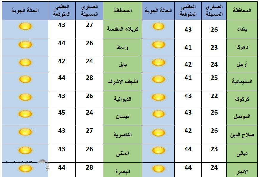 وذكر بيان للهيأة، ان "طقس يوم غد الخميس والجمعة المقبلة سيكون في الوسط والجنوب، مشمساً حاراً، وفي المنطقة الشمالية مشمساً مع ارتفاع قليل في درجات الحرارة جنوباً" مشيراً الى ان "معدل درجة الحرارة العظمى في مدينة بغداد سيكون بمعدل 43 مْ".