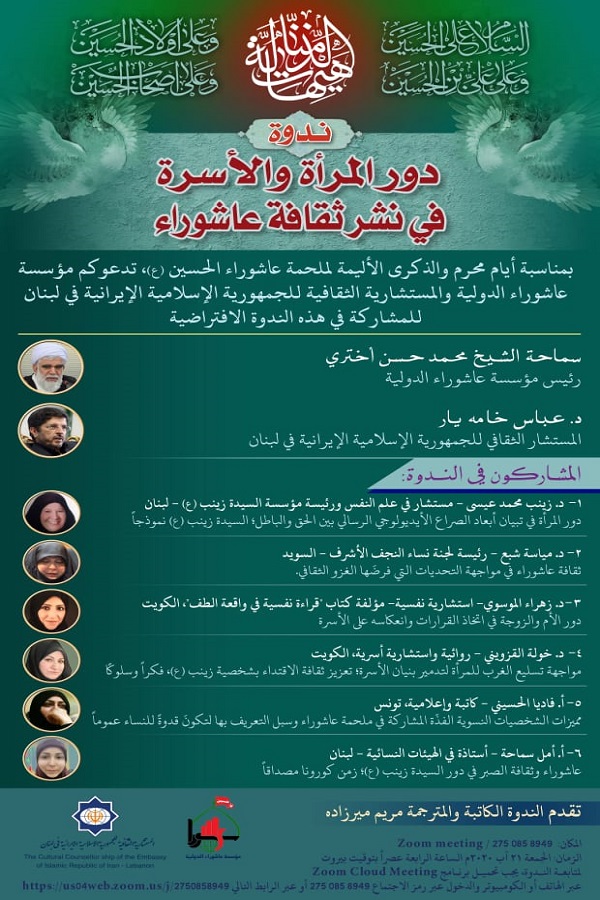 وجاء في الاعلان الذي أصدرته المستشارية الثقافية الايرانية لدى بيروت: "بمناسبة أيام محرم الحرام والذكرى الأليمة لملحمة عاشوراء الامام الحسين(ع)، تدعوكم مؤسسة عاشوراء الدولية والمستشارية الثقافية الايرانية في لبنان للمشاركة في هذه الندوة الافتراضية" التي ستعقد يوم غد الجمعة 21 أغسطس / أب الجاری عبر منصة "زوم"(Zoom Cloud Meetings) العالمية للاتصال المرئي والسمعي، .
