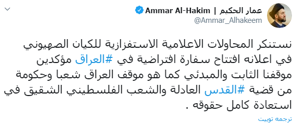 وقال الحكيم في تدوينة، على تويتر، "نستنكر المحاولات الإعلامية الاستفزازية للكيان الصهيوني في إعلانه افتتاح سفارة افتراضية في العراق، مؤكدين موقفنا الثابت والمبدئي، كما هو موقف العراق شعباً وحكومة من قضية القدس العادلة والشعب الفلسطيني الشقيق في استعادة كامل حقوقه" .