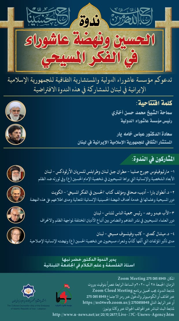 وجاء في البیان الذی اصدرته المستشاریه الثقافیه الایرانیه فی لبنان: "تدعوكم مؤسسة عاشوراء الدولیة والمستشارية الثقافية للجمهورية الإسلامية الإيرانية في لبنان للمشاركة في الندوة الافتراضیة تحت عنوان "الحسين ونهضة عاشوراء في الفكر المسيحي".