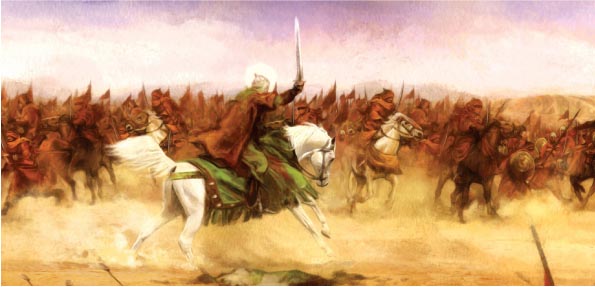 وزحف (اللعين) عمر ابن سعد بجيشه نحو معسكر الحسين (ع) وعلى الميمنة عمرو ابن الحجاج الزبيدي وعلى الميسرة شمر ابن ذو الجوشن وعلى الخيل عزره بن قيس وعلى الرجالة شبث بن ربعي والراية مع ذويد مولاه واقبلوا يجولون حول البيوت فيرون النار تضطرم في الخندق، فنادى شمر باعلى صوته يا حسين تعجلت بالنار قبل يوم القيامة فقال الحسين (ع) من هذا کانه شمر ابن ذي الجوشن قيل نعم: فقال له يا بن راعية المعزى انت اولى بها مني صيليا، ورام مسلم ابن عوسجه ان يرميه بسهم فمنعه الحسين (ع) وقال اکره ان ابدأهم بقتال.