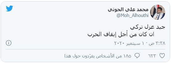 وقال الحوثي، في تغريدة له بموقع "تويتر"، إن "قرار عزل تركي جيد، إن كان من أجل إيقاف الحرب".