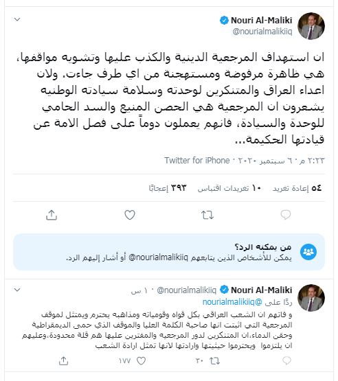وقال المالكي في تغريدة له على تويتر ، إن "استهداف المرجعية الدينية والكذب عليها وتشويه مواقفها ظاهرة مرفوضة ومستهجنة من اي طرف جاءت، ولان اعداء العراق والمتنكرين لوحدته وسلامة سيادته الوطنيه يشعرون ان المرجعية هي الحصن المنيع والسد الحامي للوحدة والسيادة، فانهم يعملون دوماً على فصل الامة عن قيادتها الحكيمة". وتابع، أن هؤلاء "فاتهم ان الشعب العراقي بكل قواه وقومياته ومذاهبه يحترم ويمتثل لموقف المرجعية التي اثبتت انها صاحبة الكلمة العليا والموقف الذي حمى الديمقراطية وحقن الدماء"، مؤكدا أن "المتنكرين لدور المرجعيه والمفترين عليها هم قلة محدودة وعليهم ان يلتزموا ويحترموا حيثيتها وارادتها لانها تمثل ارادة الشعب". وكانت عشائر وهيئات ومواكب حسينية في العاصمة العراقية بغداد والمحافظات الجنوبية قد طالبت قناة "يو تي في" التابعة للسياسي خميس الخنجر بالاعتذار فورا بعد تجاوز احد ضيوفها على مقام المرجعيات والرموز الدينية.