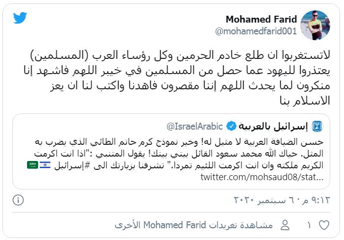 ولاقت الدعوة إشادة من "إسرائيل"، حيث قال حساب "إسرائيل بالعربية" عبر "تويتر" -التابع لوزارة الخارجية الإسرائيلية-" "حسن الضيافة العربية لا مثيل له! وخير نموذج كرم حاتم الطائي الذي يضرب به المثل".