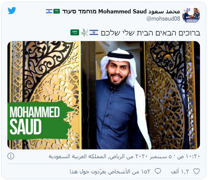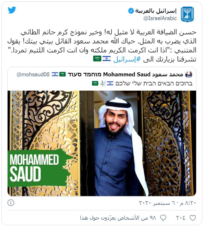 وأضاف: "حياك الله محمد سعود القائل بيتي بيتك! يقول المتنبي: إذا أنت أكرمت الكريم ملكته وإن أنت أكرمت اللئيم تمردا، تشرفنا بزيارتك إلى "إسرائيل"".