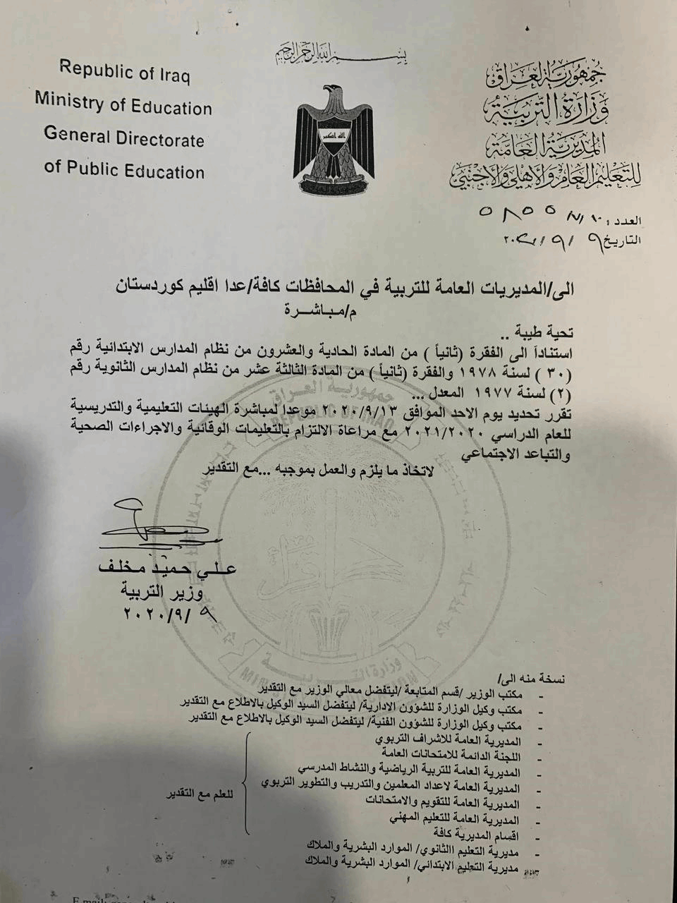 حددت وزارة التربية العراقية، الـ13 من شهر أيلول الحالي موعداً لمباشرة الهيئات التعليمية والتدريسية للعام الدراسي 2020 – 2021.