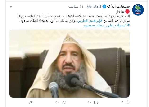 جاء ذلك في تغريدة على حساب "معتقلي الرأي" المعني بشؤون المعتقلين السعوديين على تويتر.