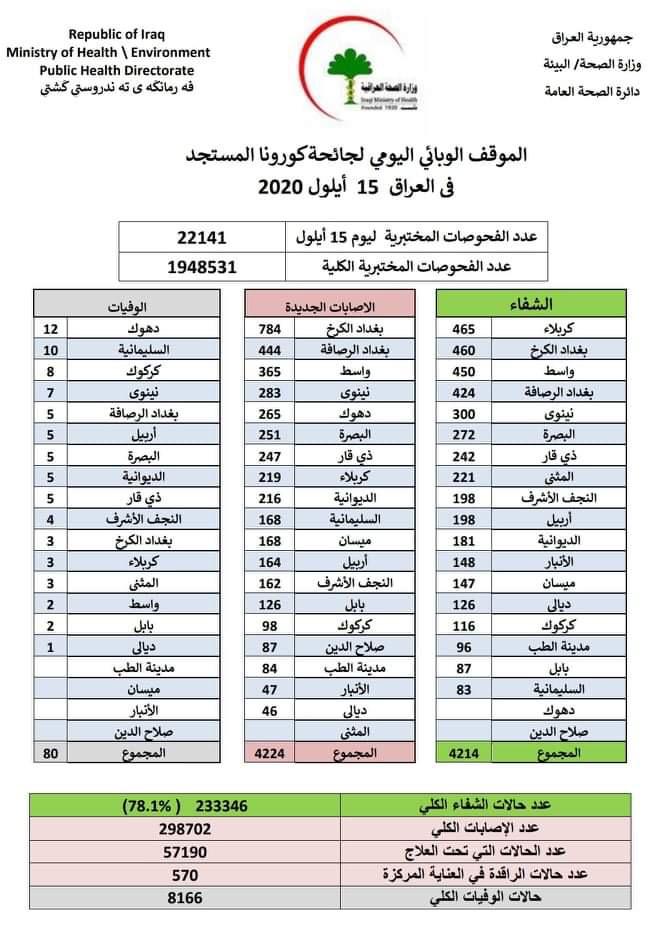 العراق_الكوثر: اعلنت وزارة الصحة العراقية، الثلاثاء، الموقف الوبائي اليومي لجائحة كورونا المستجد في العراق اليوم الثلاثاء.