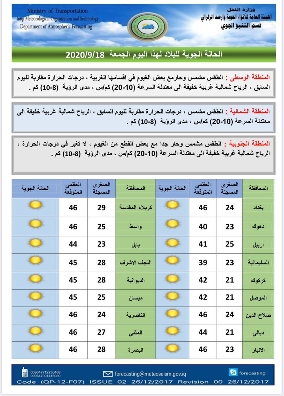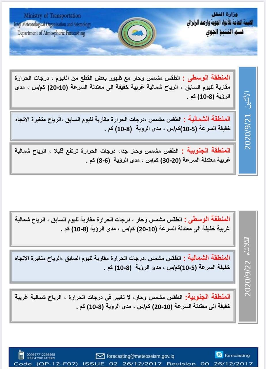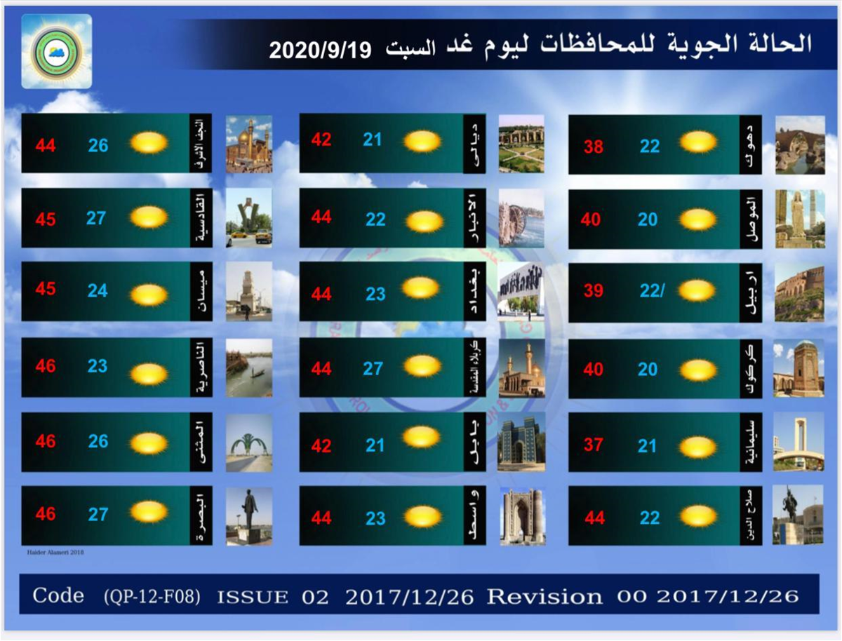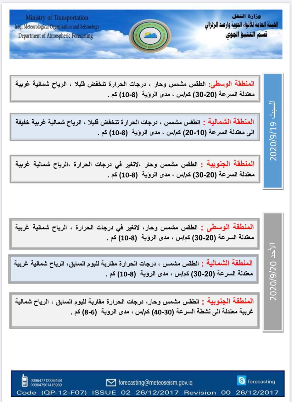 توقعت الهيئة العامة للأنواء الجوية والرصد الزلزالي، الجمعة، أن يشهد العراق طقساً مشمساً وحاراً خلال الأسبوع المقبل، لكنها أشارت إلى أن درجات الحرارة ستكون بمعدل أقل من الأيام الماضية.