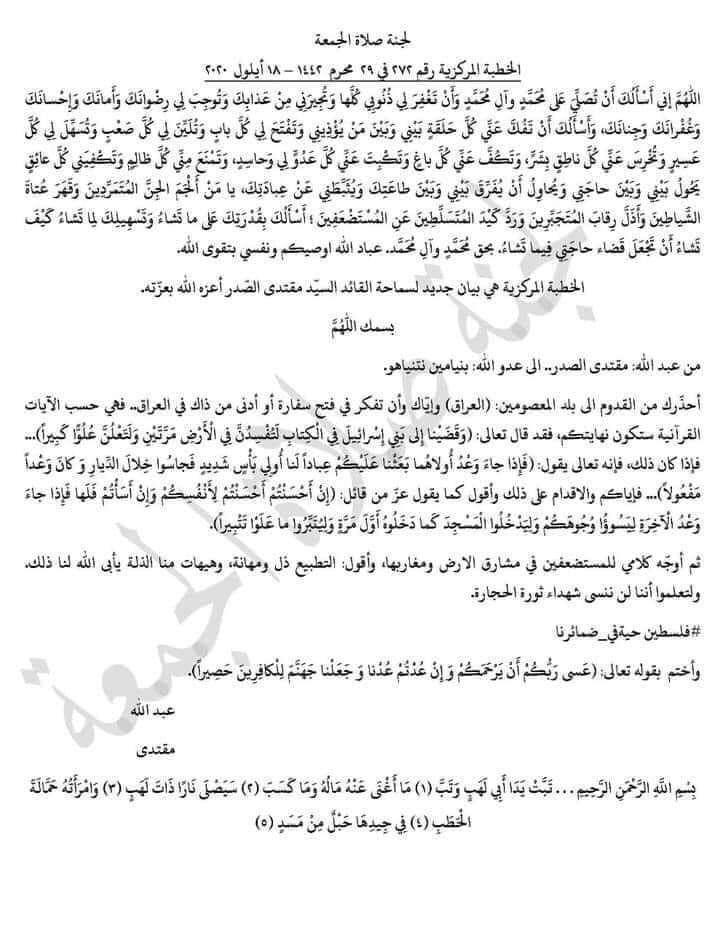 وفي خطبة الجمعة، قال السيد الصدر: "أوجه كلامي للمستضعفين في مشارق الأرض ومغاربها. أقول إن التطبيع ذل ومهانة، يأبى الله لنا المذلة، ولتعلموا أننا لن ننسى شهداء ثورة الحجارة (في إشارة للانتفاضة الأولى)، وستبقى فلسطين حيّة في ضمائرنا".