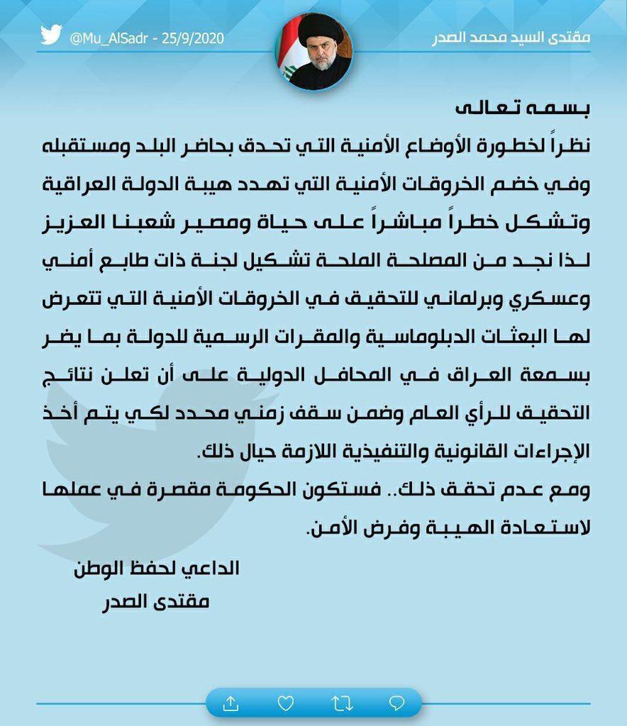 وذكر الصدر في تغريدة على منصة "تويتر"، أنه "نظراً لخطورة الأوضاع الأمنية التي تحدق بحاضر البلد ومستقبله وفي خضم الخروقات الأمنية التي تهدد هيبة الدولة العراقية، وتشكل خطراً مباشراً على حياة ومصير شعبنا العزيز، لذا نجد من المصلحة الملحة تشكيل لجنة ذات طابع أمني وعسكري وبرلماني".