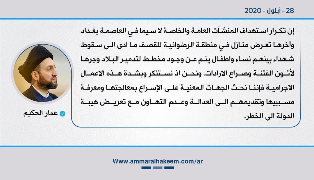 وقال الحكيم في بيان، إن تكرار استهداف المنشآت العامة والخاصة لاسيما في العاصمة بغداد، وآخرها تعرض منازل في منطقة الرضوانية للقصف ما أدى إلى سقوط شهداء بينهم نساء واطفال، ينم عن وجود مخطط لتدمير البلاد وجرها لأتون الفتنة وصراع الارادات.