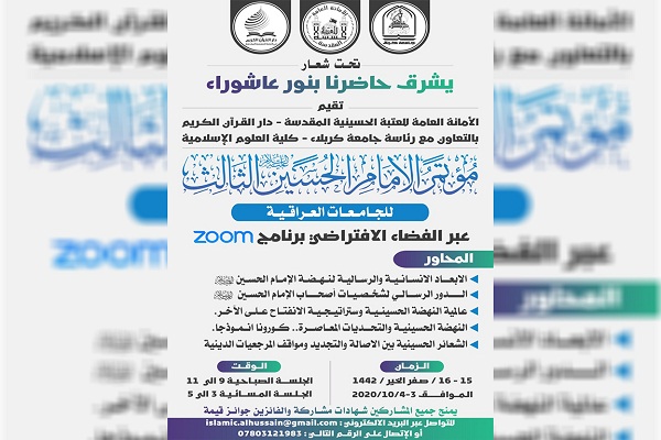 وأضاف الشيخ المنصوري أن المؤتمر سينعقد تحت شعار: (يشرق حاضرنا بنور عاشوراء) خلال يومي 15 و16 من شهر صفر الجاري بجلستين صباحية ومسائية باستضافة شخصيات دينية واكاديمية، فيما سيتم تكريم أصحاب المقالات الخمس الفائزة بجوائز قيمة، كما سيتم تكريم المشاركين جميعاً بالشهادات والدروع في ختام الفعاليات لمؤتمر الإمام الحسين الثالث للجامعات العراقية.