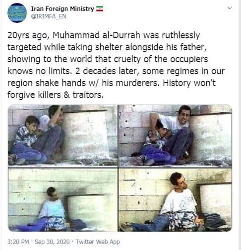 وفي تغريدة على صفحتها الرسمية في موقع تويتر، قالت وزارة خارجية الجمهورية الاسلامية الايرانية: قبل عشرين عاما، أثناء احتمائه مع والده، تم استهداف محمد الدرة بوحشية، وأظهر للعالم أن قسوة المحتلين لا حدود لها.