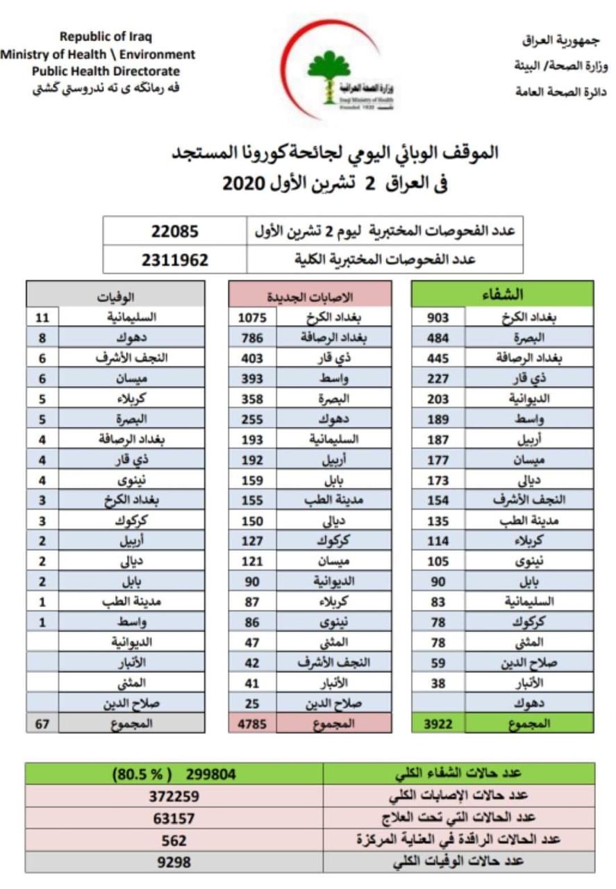 وذكرت الوزارة في بيان، ان "مجموع الإصابات الكلي بلغ 372259 حالة، ومجموع حالات الشفاء الكلي 299804 ، وعدد حالات الوفيات الكلي 9298 حالة".