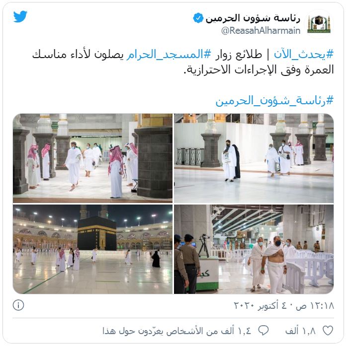 ونقلت الرئاسة صورا لدخول المعتمرين الحرم المكي، مؤكدة أن ذلك يجري وفق الإجراءات الاحترازية، دون تفاصيل أكثر حول طبيعة تلك الإجراءات.