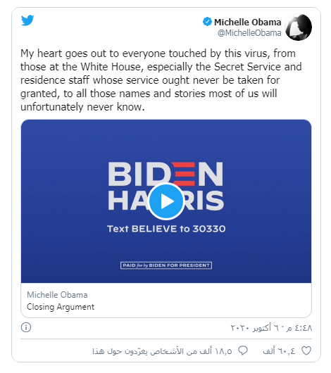 ووجهت ميشيل أوباما رسالة إلى كل مصابي كورونا خاصة أولئك الذين كانوا داخل البيت الأبيض وخالطوا الرئيس دونالد ترامب، الذي أعلن إصابته قبل أيام.