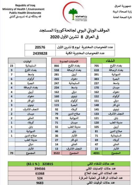 الصحة العراقية تعلن الموقف الوبائي لـ كورونا بإرتفاع مؤشر الشفاء والوفيات معا