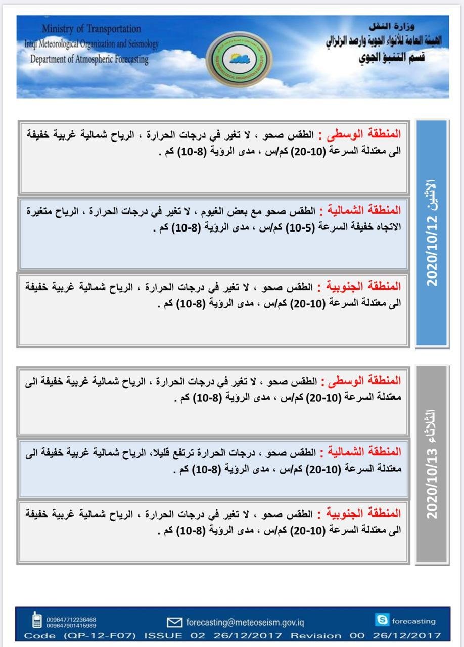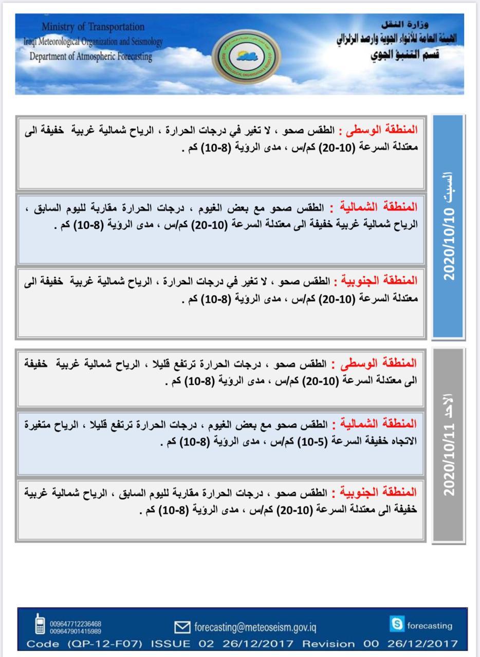 العراق_الكوثر: توقع قسم التنبؤ الجوي في الهيئة العامة للأنواء الجوية والرصد الزلزالي في العراق، الجمعة، أن يكون طقس العراق صحواً مع استمرار درجات الحرارة في معدلاتها الحالية، حتى منتصف الأسبوع المقبل.