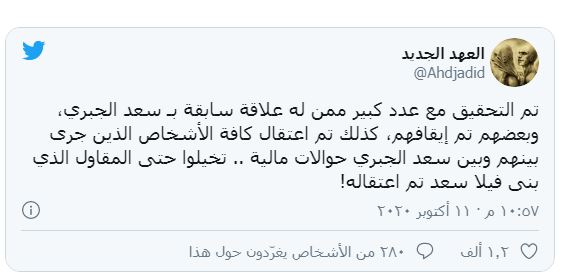 وأوضح الحساب في تغريدة عبر "تويتر"، أنه "تم التحقيق مع عدد كبير ممن له علاقة سابقة بسعد الجبري، وبعضهم تم إيقافهم".