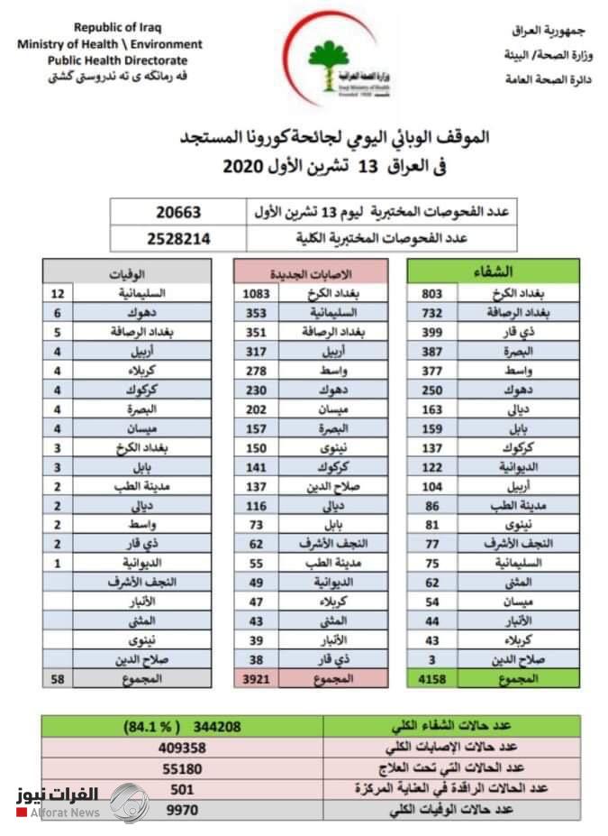 العراق_ الكوثر: اعلنت وزارة الصحة والبيئة، اليوم الثلاثاء، عن الموقف الوبائي اليومي لفايروس كورونا المستجد، مسجلة ارتفاع جديد بالاصابات مع استمرار تسجيل حالات شفاء اكثر. وبحسب الموقف الوبائي، فإنه "تم تسجيل 3921 اصابة جديدة بكورونا في الوقت الذي سجلت فيه 4158 حالة شفاء كما سجلت ايضا 58 حالة وفاة".
