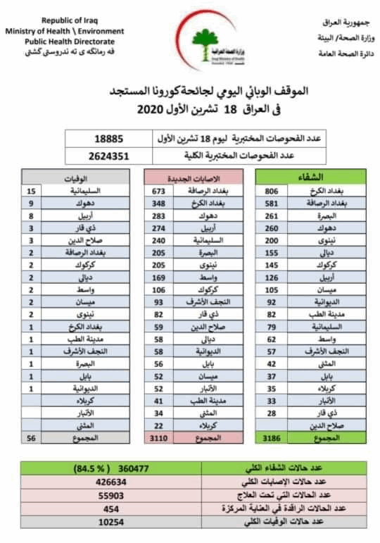 العراق_الكوثر: أعلنت وزارة الصحة، الأحد، تسجيل 3110 إصابات جديدة بفايروس كورونا و3186 حالة شفاء، ووفاة 56 مصاباً بالوباء في عموم العراق.
