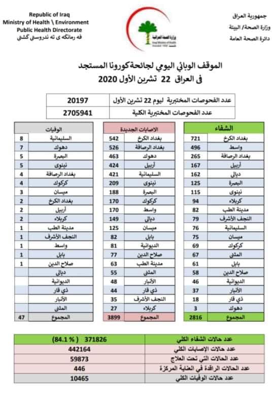 العراق_الكوثر: أعلنت وزارة الصحة والبيئة، الخميس، تسجيل 47 حالة وفاة جديدة، و3899 إصابة اضافية، و2816 حالة شفاء أخرى من عدوى فيروس كورونا المستجد خلال 24 ساعة الماضية في عموم محافظات العراق.