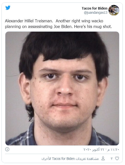 وكانت هيئة المحلفين الفيدرالية وجهت لائحة اتهام ضد ألكسندر هيليل تريسمان (19 عاما) في سبتمبر الماضي بتهمة حيازة صور لمواد إباحية للأطفال، وبعد التحقيق في مقتنياته وحساباته على وسائل التواصل الاجتماعي، توصل المحققون لوجود نية ارتكابه إطلاق نار جماعي في عيد الميلاد أو "الجمعة السوداء"، فضلا عن مخطط لاغتيال بايدن.