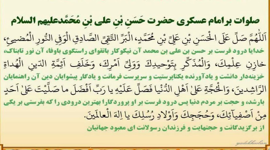 اَللّـهُمَّ صَلِّ عَلَى الْحَسَنِ بْنِ عَلِىِّ بْنِ مُحَمَّد، الْبَرِّ التَّقِىُّ الصّادِقِ الْوَفِىِّ، النُّورِ الْمُضيءِ خازِنِ عِلْمِكَ وَالْمُذَكِّرِ بِتَوْحيدِكَ، وَوَلِىِّ اَمْرِكَ وَخَلَفِ اَئِمَّةِ الدّينَ الْهُداةِ الرّاشِدينَ، وَالْحُجَّةِ عَلى اَهْلِ الدُّنْيا، فَصَلِّ عَلَيْهِ يا رَبِّ اَفْضَلَ ما صَلَّيْتَ عَلى اَحَد مِنْ اَصْفِيائِكَ وَحُجَجِكَ وَاَوْلادِ رُسُلِكَ، يا اِلـهَ الْعالَمينَ .