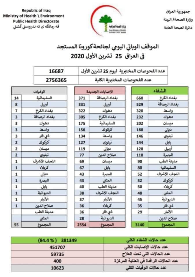 وذكرت الوزارة في بيان، أنه "تم تسجيل 2554 إصابة جديدة بكورونا، فضلاً عن تماثل 3140 حالة للشفاء من الوباء". وأضافت أنه "تم تسجيل 55 حالة وفاة بالوباء".