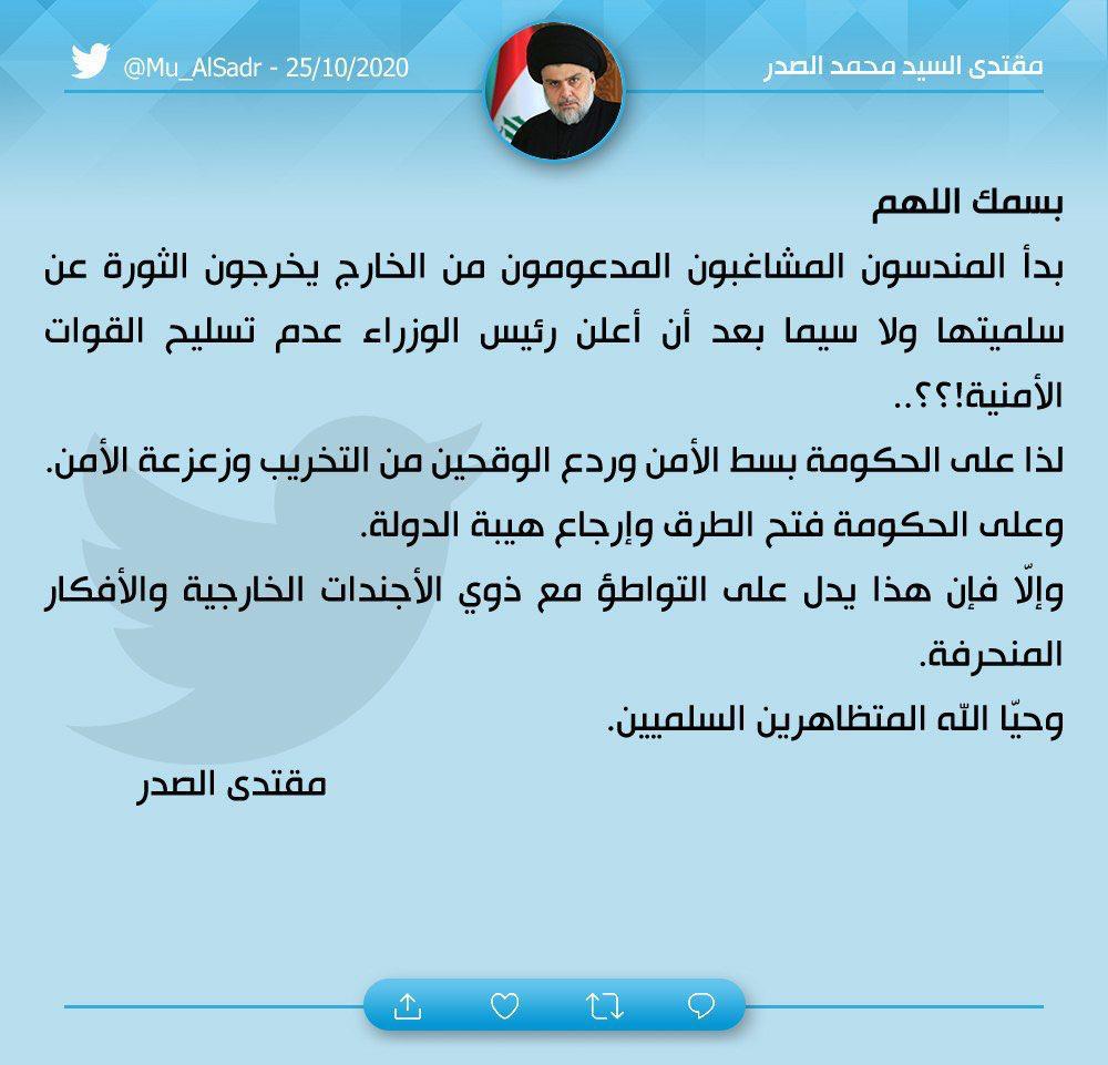 واتهم الصدر مندسين بمحاولة اخراج الثورة عن سلميتها، فيما دعا الحكومة الى بسط الامن وردع الوقحين.