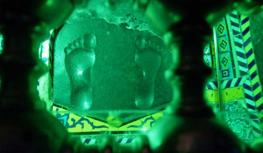 الإمام الرضا (عليه السلام) في طريقه نحو خراسان خلف تراثاً مباركاً في مدينة نيشابور، ففي موضع قدمه المبارك المسماة " قدمگاه " هناك ينبوع زاخر بالمياه الصافية العذبة قيل إنه نبع بفضله وكرامته، والأهم من كل ذلك هو مركز ومحور هذا المكان المبارك وهو الحجر المقدس الذي فيه أثر لقدمين ولونه أسود حيث يبلغ عرضه 53 سم وقد نصب في جدار المقام المبارك، ويعتقد السكنة المحليون أن هذين الأثرين على الحجر هما لقدمي الإمام حينما وقف عليه، ولكن الحقيقة أن محبي أهل البيت (عليهم السلام) نقشوهما حباً به وتيمناً بشخصيته المعصومة الكريمة لما اجتاز مدينتهم.