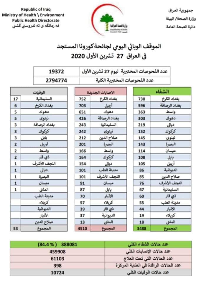 العراق_الكوثر: اعلنت وزارة الصحة، الثلاثاء، تسجيل 3488 حالة شفاء من كورونا، يقابلها 4510 اصابات جديدة و53 وفاة في عموم المحافظات.