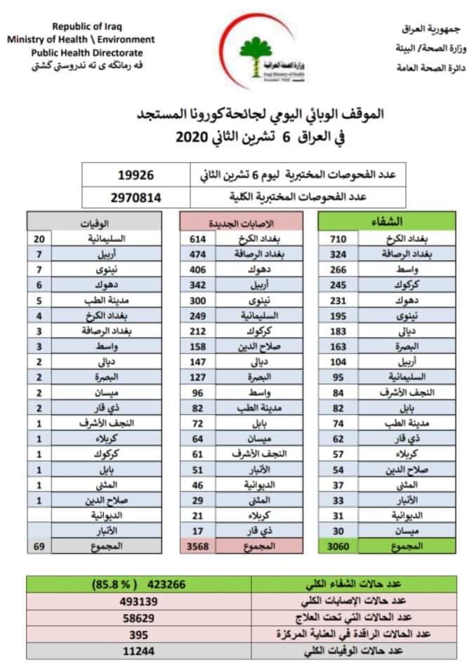 العراق_الكوثر: أعلنت وزارة الصحة والبيئة، الجمعة، تسجيل 69 حالة وفاة جديدة، و3568 إصابة اضافية، و3060 حالة شفاء أخرى من عدوى فيروس كورونا المستجد خلال 24 ساعة الماضية في عموم محافظات العراق.