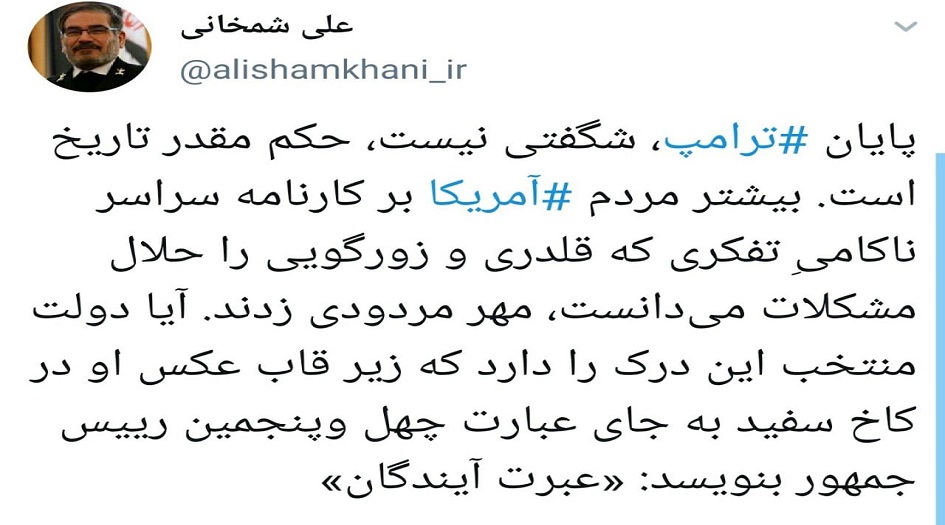 واضاف شمخاني في تغريدة له نشرها على حسابه في موقع تويتر للتواصل الاجتماعي، أن المهم في ذلك (هزيمة ترامب) هو أن الشعب الأميركي بصم رافضا سلسلة من الأعمال التي ترتكز على فكرة فاشلة هي أن جميع المشاكل يمكن حلها عبر الغطرسة والبلطجة والابتزاز.