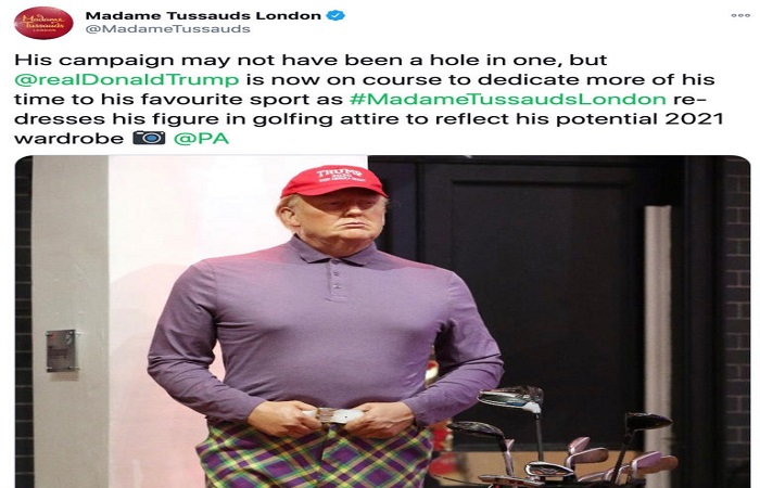وكان تمثال ترامب في متحف مدام توسو مكتسيا ببدلة سوداء طيلة فترة رئاسته للولايات المتحدة، إلا أن هذه البدلة تم استبدالها، امس السبت، بملابس الغولف، الرياضة المفضلة للرئيس المنتهية ولايته، وإلى جانبها سلة تضم العصي المخصصة للعبة.