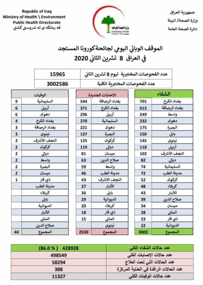 العراق_الكوثر: أعلنت وزارة الصحة، الأحد، تسجيل 2530 إصابة جديدة بفايروس كورونا، و3002 حالة شفاء، ووفاة 44 مصاباً بالوباء في عموم العراق.