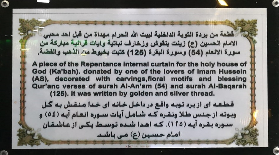 وقال مسؤول متحف الإمام الحسين (عليه السلام) التابع للعتبة الحسينية المقدسة الدكتور علاء ضياء الدين في حديث للموقع الرسمي، إن "المتحف يحتوي على العديد من النفائس والمقتنيات تعود إلى عقود من الزمن ومنها لعدة سنوات، من بينها هدية تم استلامها من أحد المحبين للإمام الحسين (عليه السلام) وهي عبارة عن قطعة من (بردة الكعبة المشرفة)".