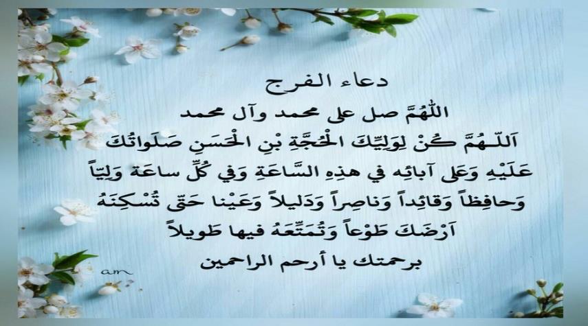 اللهم كن لوليك الحجة بن الحسن صلواتك عليه وعلى أبائه في هذه الساعة وفي كل ساعة من ساعات الليل والنهار وليا وحافظا وقائدا وناصرا ودليلا وعينا حتى تسكنه أرضك طوعا وتمتعه فيها طويلا برحمتك يا أرحم الراحمين..