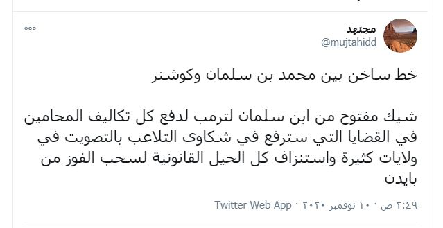 وقال مجتهد في تغريدة ، إن محمد بن سلمان ومستشار ترامب الخاص جاريد كوشنر فتحا خط ساخن من أجل بحث إمكانية إبقاء ترامب في منصبه وتكلف محمد بن سلمان بتكاليف الدعاوى القضائية ضد جو بايدن.