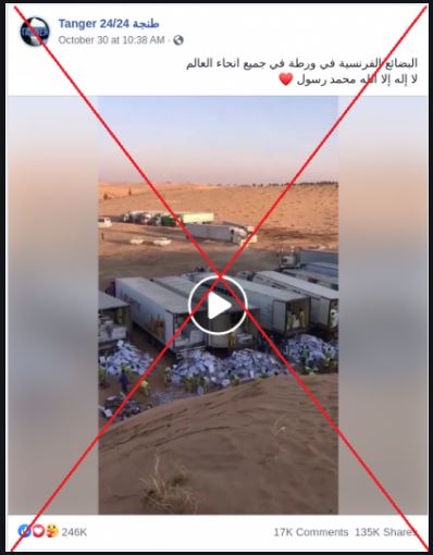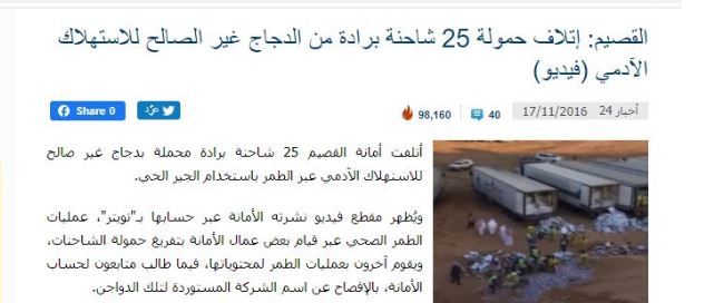 لكن بالبحث عن المقطع المذكور، تبين أن الفيديو يعود لعام 2016 ، وأنه يظهر "نحو 25 شاحنة متوقفة في الصحراء مع عمال يفرغون حمولتها ويلقون آلاف الدواجن، وذلك في اطار عملية رسمية بإشراف أمانة منطقة القصيم في السعودية للتخلص من نحو 80 ألف علبة دجاج منتهية الصلاحية وغير صالحة للاستهلاك البشري".