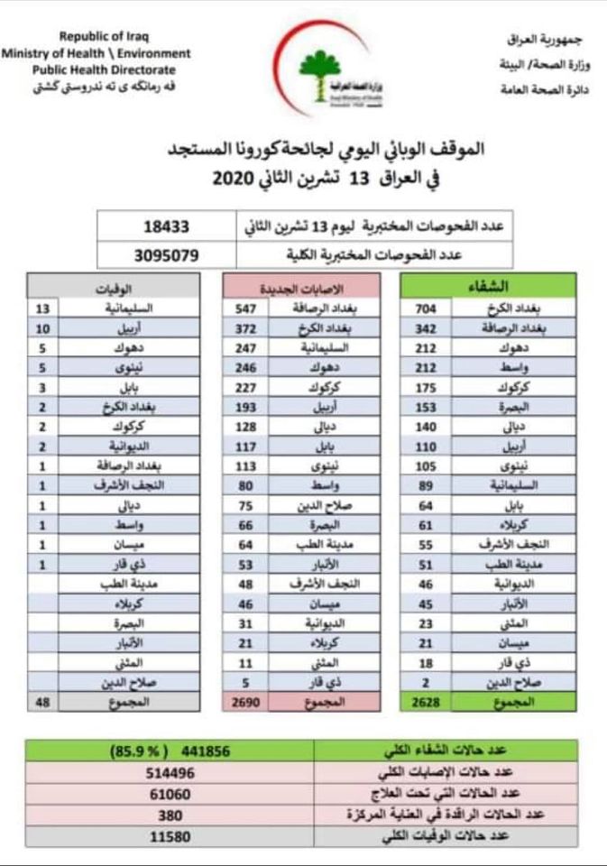 في العراق لليوم (13 تشرين الثاني 2020) جاء كالتالي: