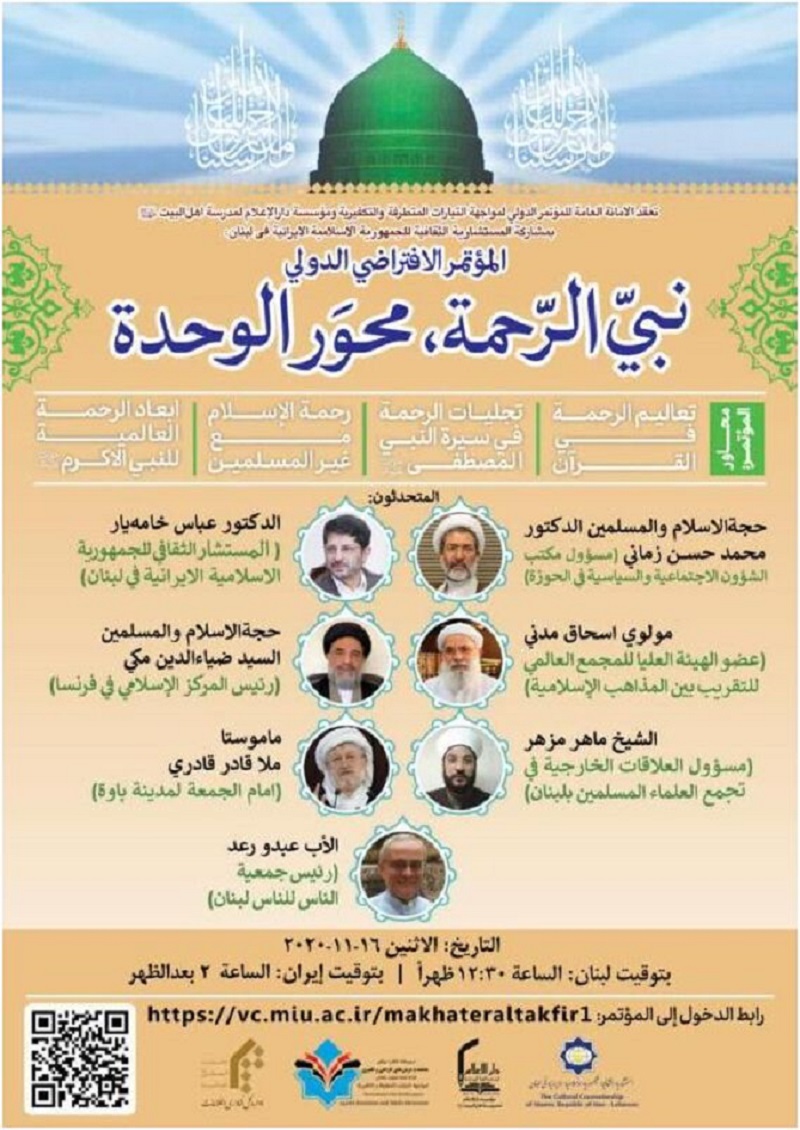 ويتحدث في هذا المؤتمر الافتراضي حجة الاسلام والمسلمین الدکتور محمد حسن زماني (مسوول مکتب الشوون الاجتماعیة والسیاسیة في الحوزة) والدکتور عباس خامه یار (المستشار الثقافي للجمهوریة الاسلامیة الایرانیة في لبنان) ومولوي اسحاق مدني (عضو الهیئة العلیا في المجمع العالمي للتقریب بین المذاهب الاسلامیة) وحجة الاسلام والمسلمین السید ضیاء الدین مکي (رئیس المرکز الاسلامي في فرنسا) والشیخ ماهر مزهر (مسوول العلاقات الخارجیة في تجمع العلماء المسلمین بلبنان) وكذلك ماموستا قادر قادري (امام جمعة لمدینة پاوة) والأب عبدو رعد (رئیس جمعیة الناس للناس لبنان).