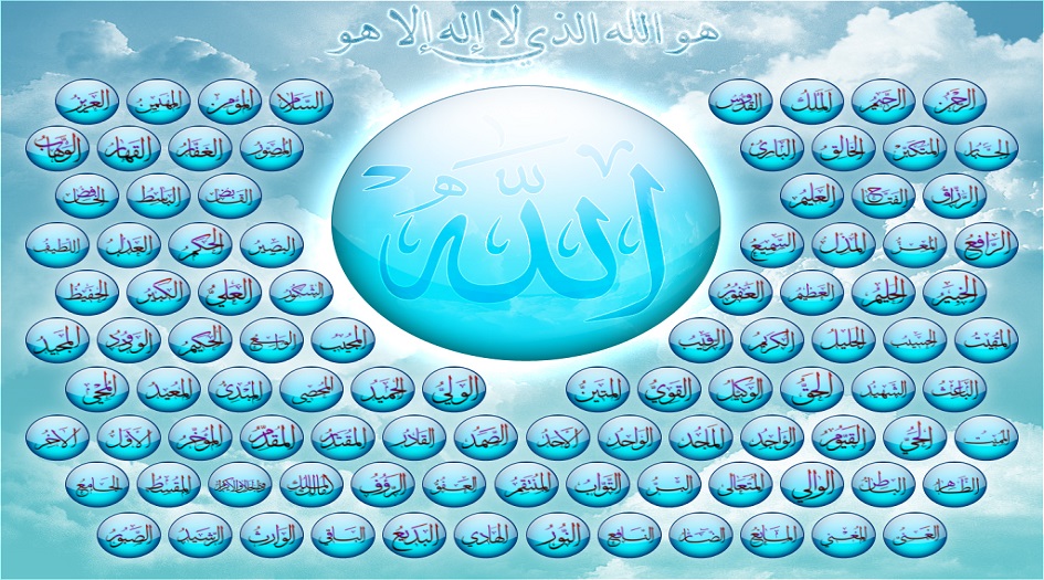 الرحمن، الرحيم، الملك، القدوس، السلام، المؤمن، المهيمن، العزيز، الجبار، المتكبر، الخالق، البارئ، المصور، الغفار، القهار، الوهاب، الرزّاق، الفتّاح، العليم، القابض، الباسط، الخافض، الرافع، المعزّ، المذلّ، السميع، البصير، الحكم، العدل، اللطيف، الخبير، الحليم، العظيم، الغفور، الشكور، العلي، الكبير، الحفيظ، المقيت، الحسيب، الجليل، الجميل، الكريم، الرقيب، المجيب، الواسع، الحليم، الودود، المجيد، الباعث، الشهيد، الحق، الوكيل، القوي، المتين، الولي، الحميد، المحصي، المبدئ، المعيد، المحيي، المميت، الحي، القيوم، الواجد، الماجد، الواحد، الأحد، الصمد، القادر، المقتدر، المقدّم، المؤخّر، الأول، الآخر، الظاهر، الباطن، الوالي، المتعالي، البر، التواب، المنتقم، العفو، الرؤوف، مالك الملك، ذو الجلال والإكرام، المقسط، الجامع، الغني، المغني، المعطي، المانع، الضار، النافع، النور، الهادي، البديع، الباقي، الوارث، الرشيد، الصبور