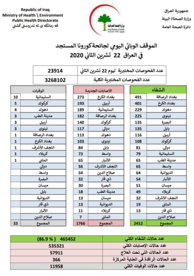 العراق_الكوثر: اعلنت وزارة الصحة، الاحد، تسجيل 2412 حالة شفاء من كورونا يقابلها 1766 اصابة جديدة و33 وفاة في عموم مناطق البلاد.