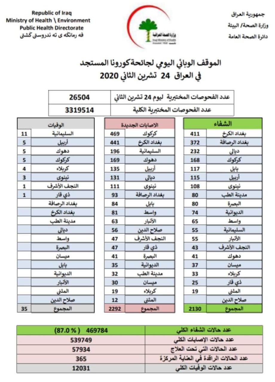 وسجلت الوزارة 2292 إصابة جديدة بفيروس كورونا ، وتماثل 2130 مصاباً للشفاء من كورونا. وتم تسجيل 35 حالة وفاة جديدة بكورونا.