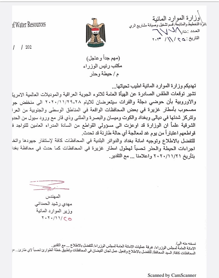 حذرت وزارة الموارد المائية، الاربعاء، من منخفض جوي يومي السبت والاحد المقبلين، فيما نوهت الى موجة امطار غزيرة في عدد من المحافظات.