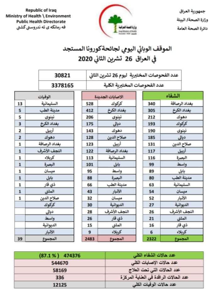العراق_الكوثر: أعلنت وزارة الصحة والبيئة، الخميس، تسجيل 39 حالة وفاة جديدة، و2483 إصابة اضافية، و2322 حالة شفاء أخرى من عدوى فيروس كورونا المستجد خلال 24 ساعة الماضية في عموم محافظات العراق.