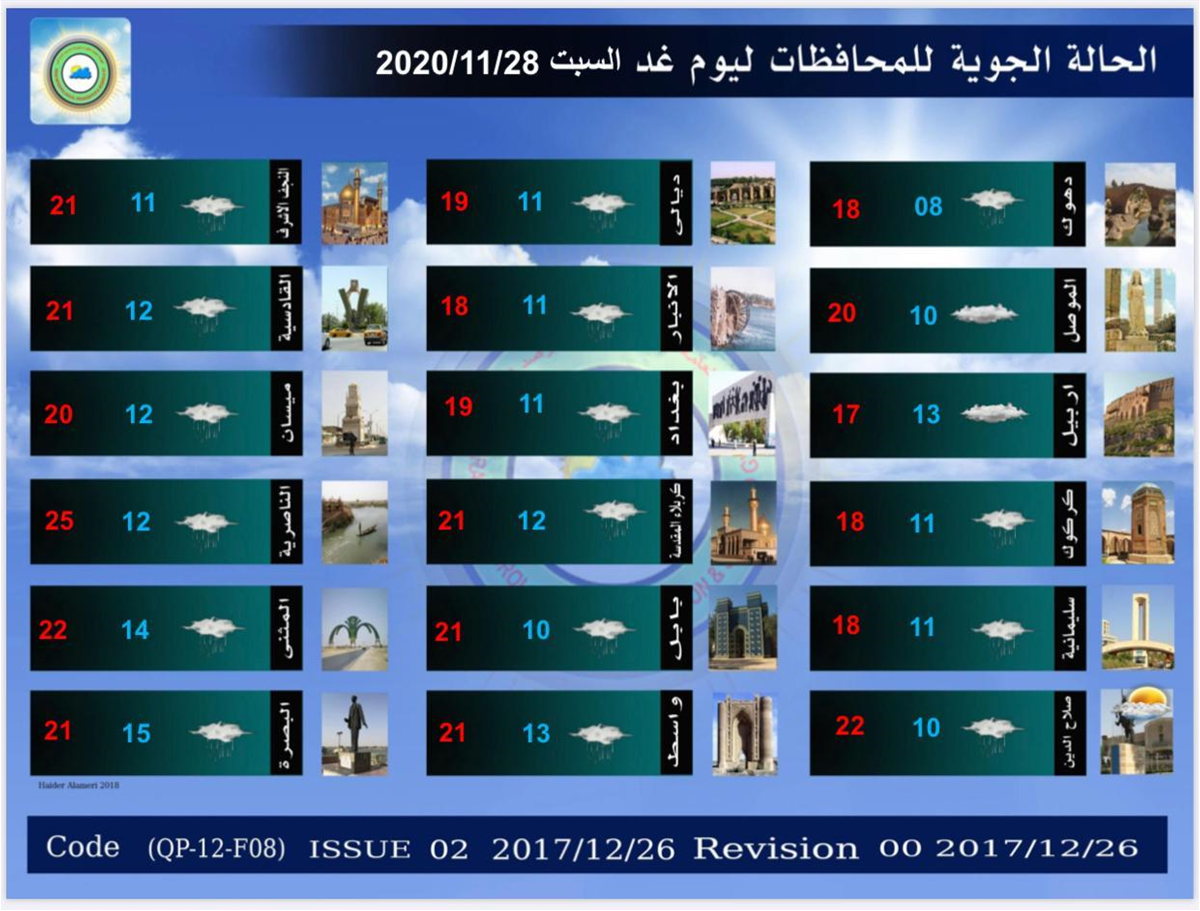 العراق - الكوثر: أصدرت الهيئة العامة للأنواء الجوية والرصد الزلزالي، الجمعة توقعاتها بشأن حالة الطقس في العراق خلال الأسبوع المقبل، متوقعة هطول أمطار غزيرة وهبوب عواصف رعدية.